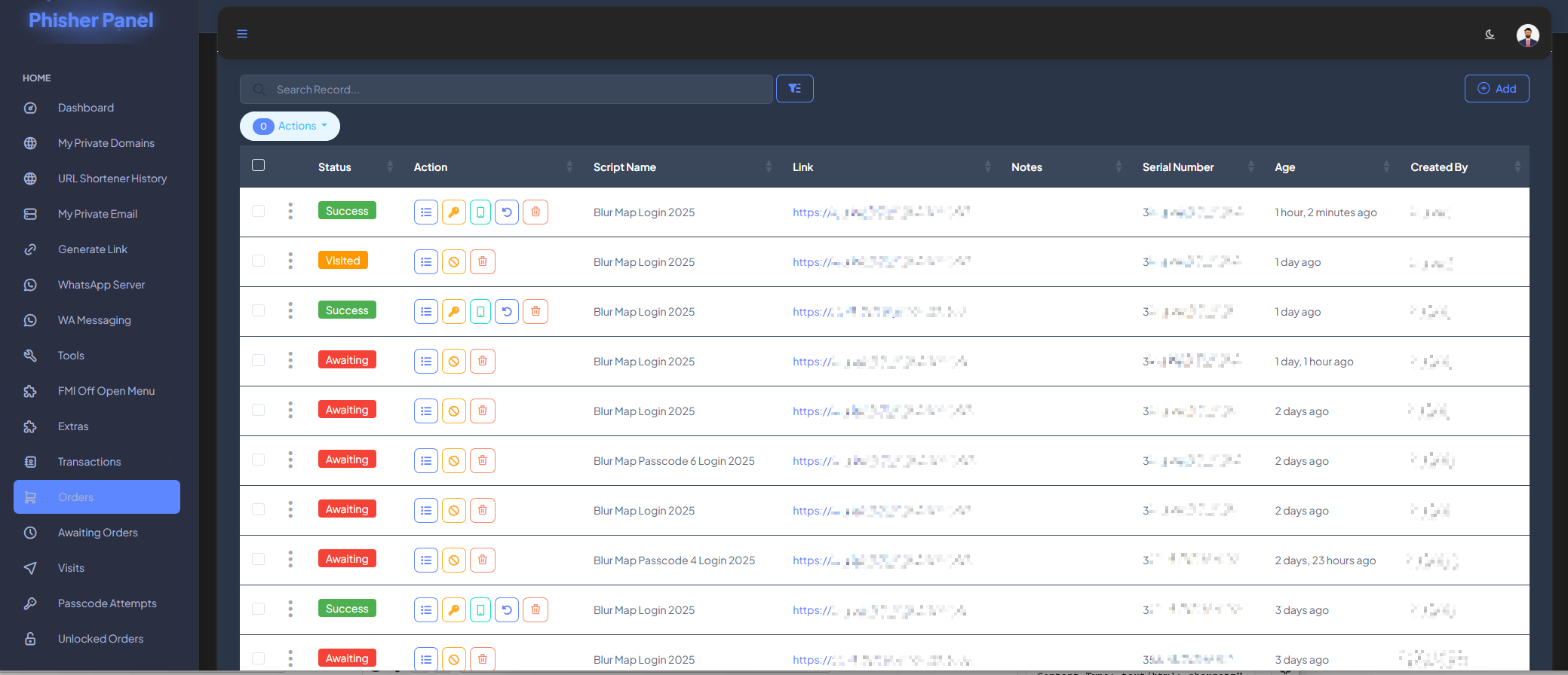 The dashboard exposed multiple sections for managing phishing operations. One of the tabs contained a table with all phishing attempts logged under the operator’s account.