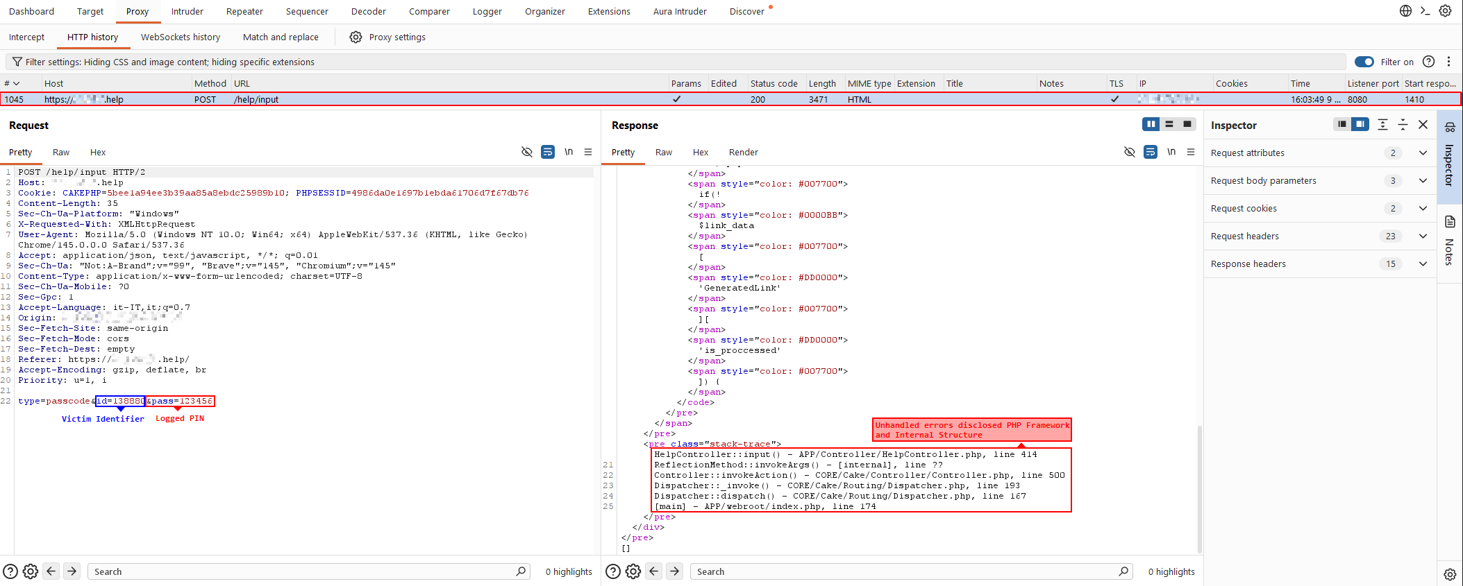 The server response also leaked references to the CakePHP framework and internal application paths — not directly exploitable here, but useful for the next phase: knowing the framework helps narrow down likely file structures and routes to fuzz.