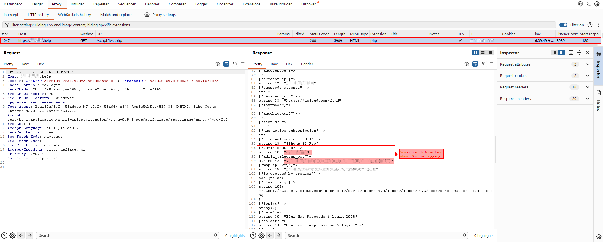 The dump contained several internal session variables describing the active phishing campaign: phished phone model, campaign creator ip, and various backend references.