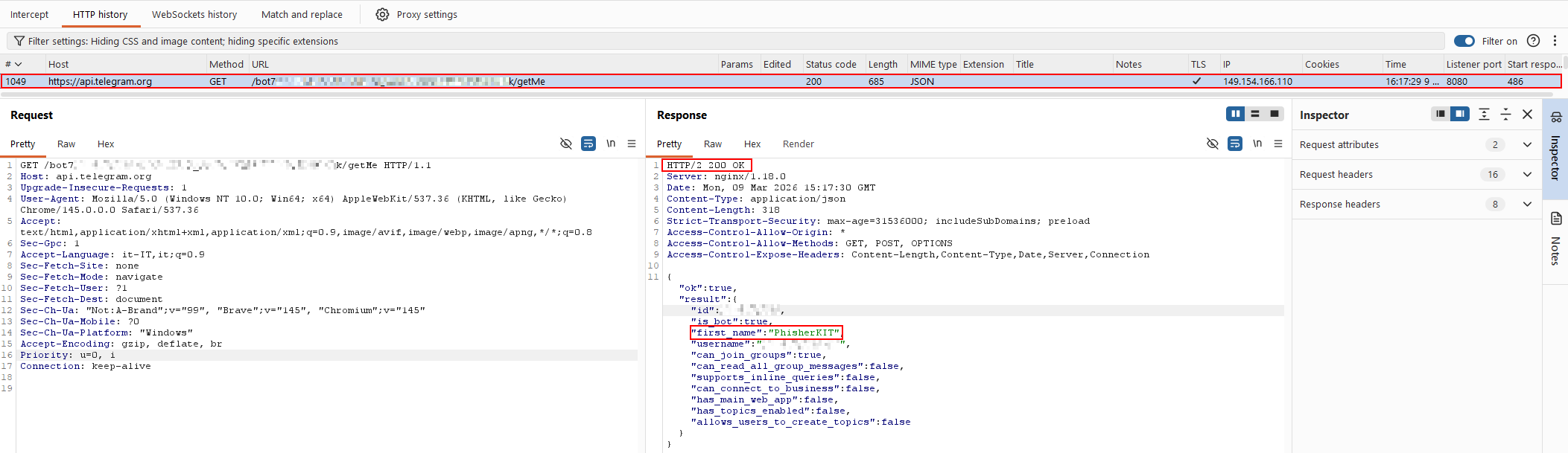 Figure 6 — Telegram Bot API getMe response (redacted).