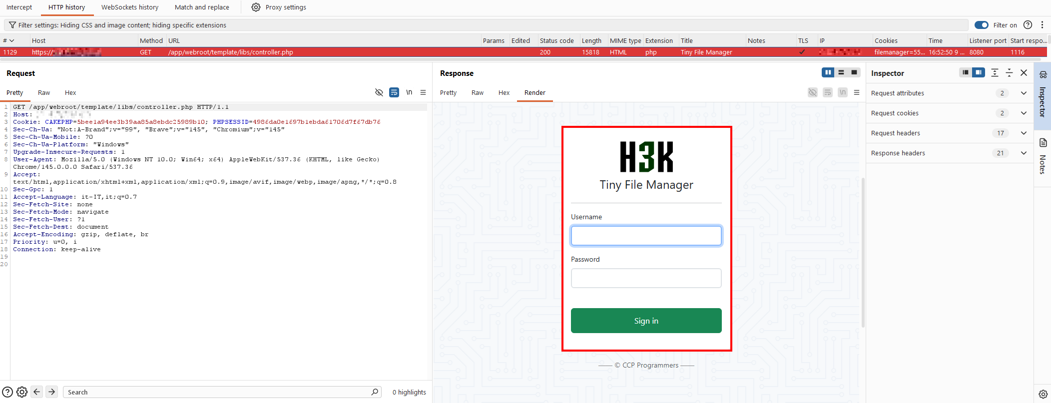 Tiny File Manager ships with publicly documented default credentials that most deployments never change. Testing them here worked immediately.